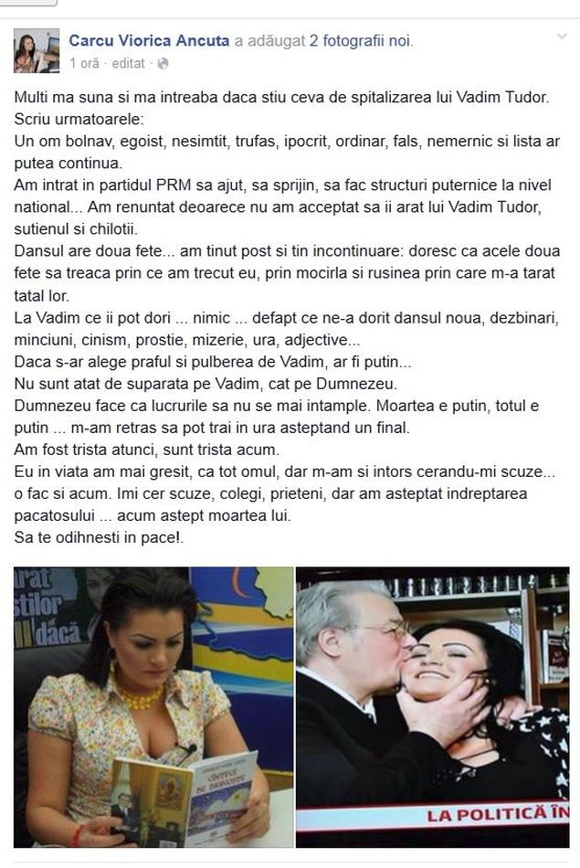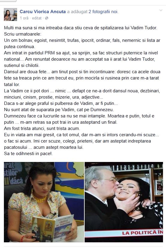 Ancuta si Vadim s-au certat intr-o emisiune de televiziune, atunci cand tribunul a jignit-o in fel si chip. Scarbita, Ancuta a renuntat sa mai faca politica si apoi a plecat si din tara. Cu doar o ora inainte sa moara adversarul sau, Ancuta a lasat un mesaj extrem de dur la adresa politicianului.