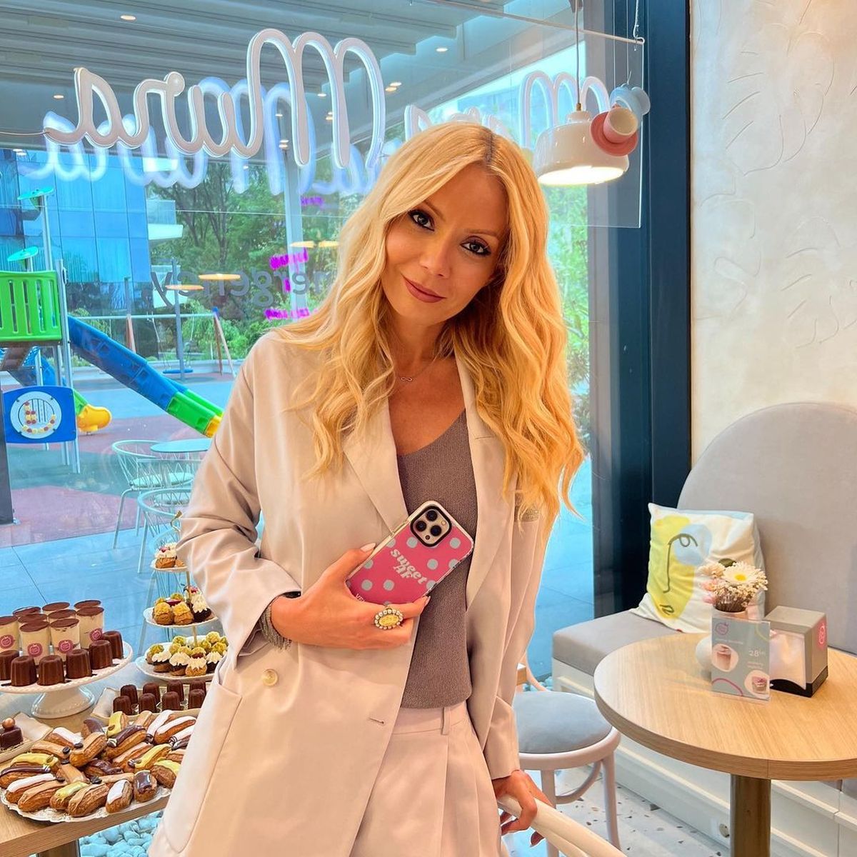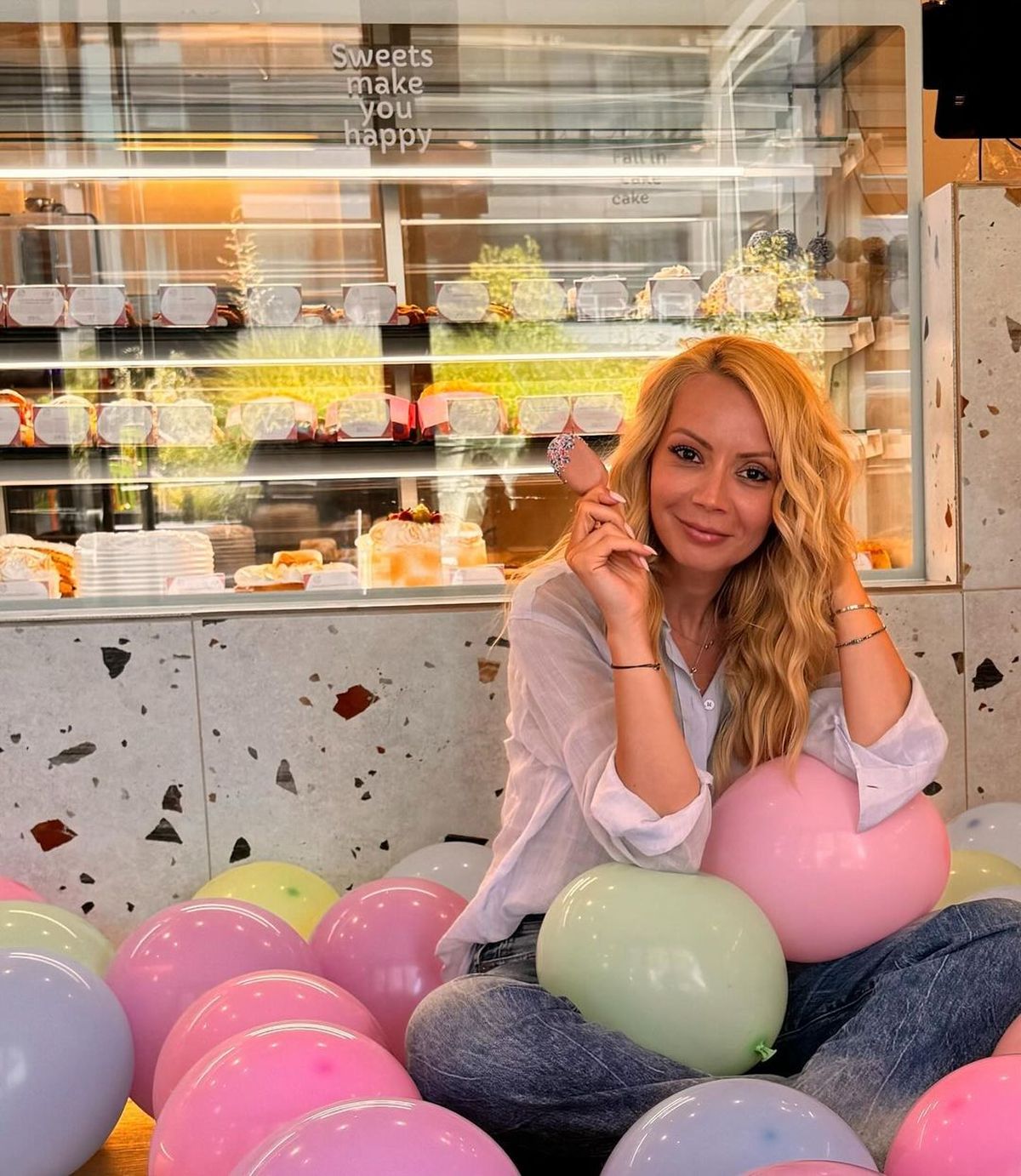 Daciana Sârbu, într-una dintre cofetăriile sale din București, înconjurată de dulciuri și baloane