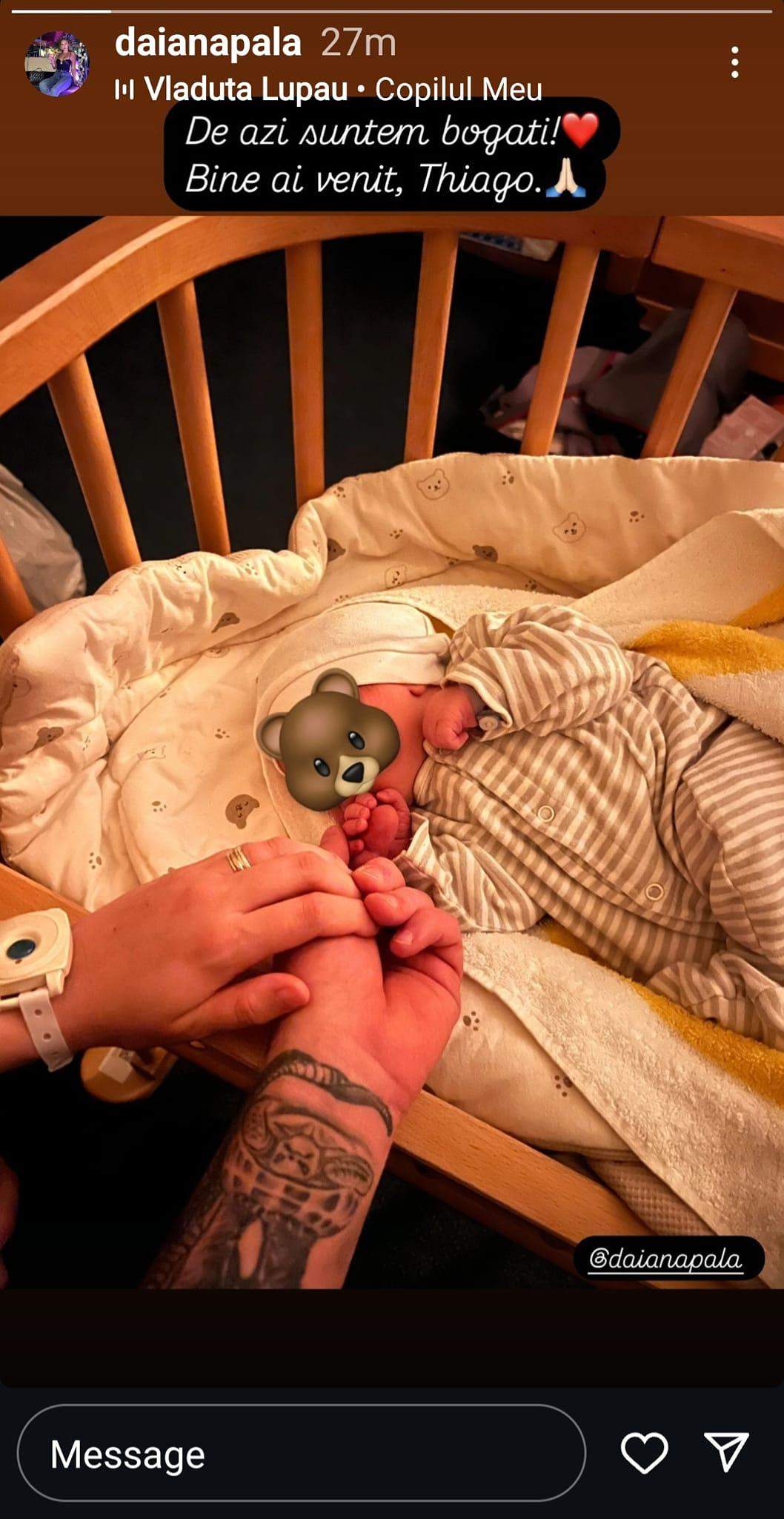 „De azi suntem bogați. Bine ai venit, Thiago”, a scris Daiana pe Instagram.