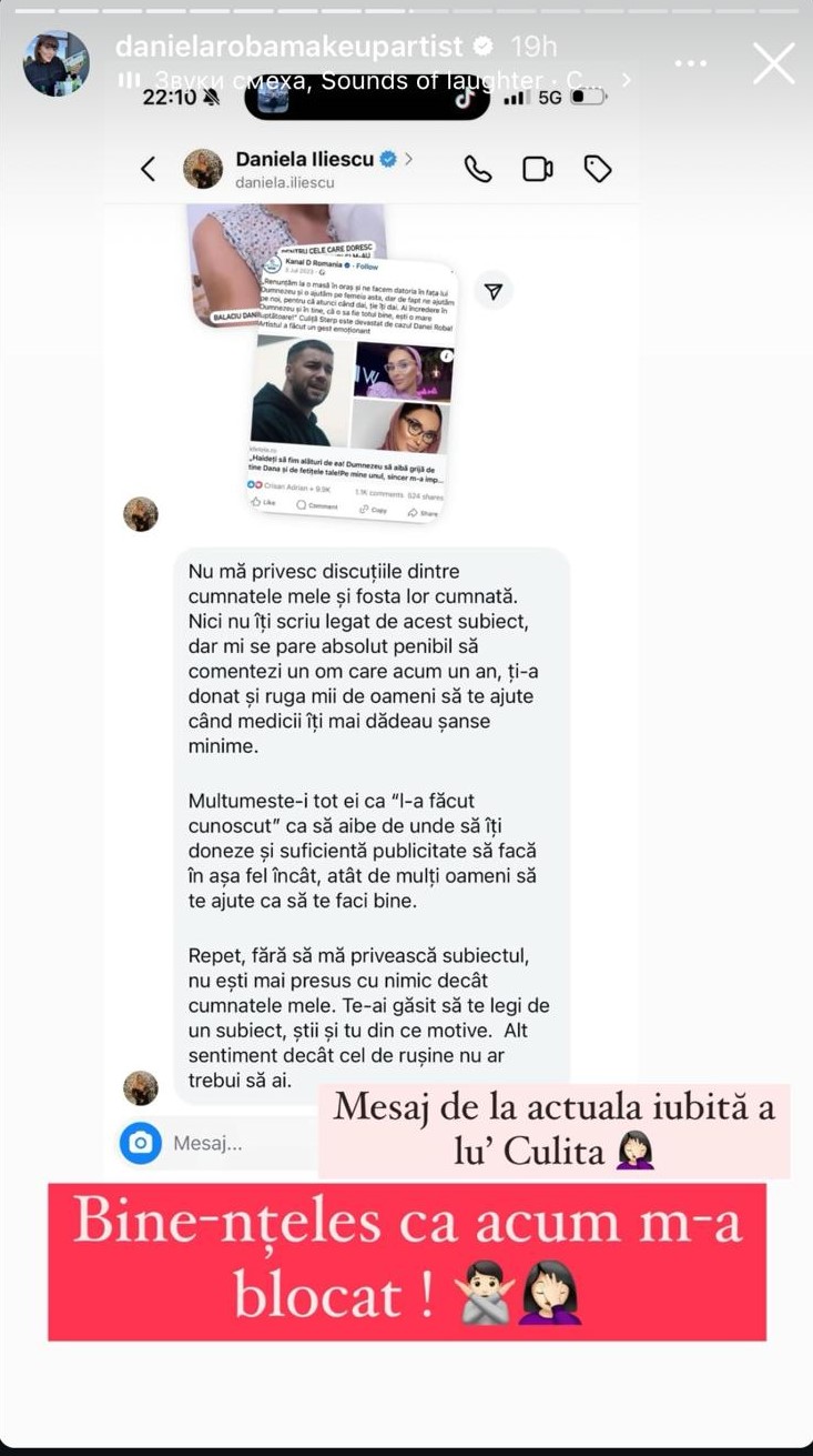 Dana Roba a publicat pe Instagram conversația pe care a purtat-o cu Daniela Iliescu. Blondina i-a reamintit make-up artistei de faptul că artistul i-a donat o sumă de bani atunci când ea se afla în spital, în pragul morții.