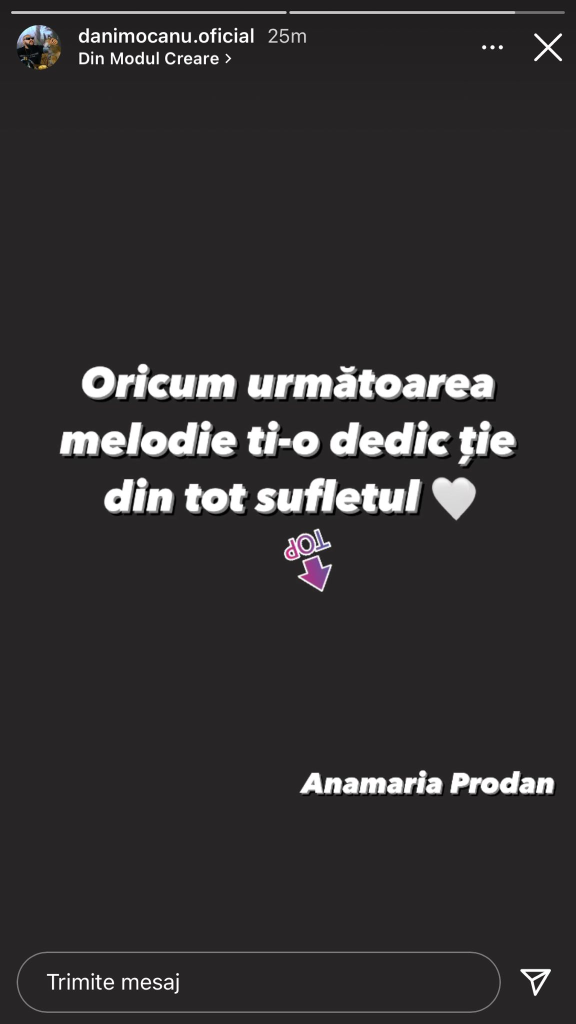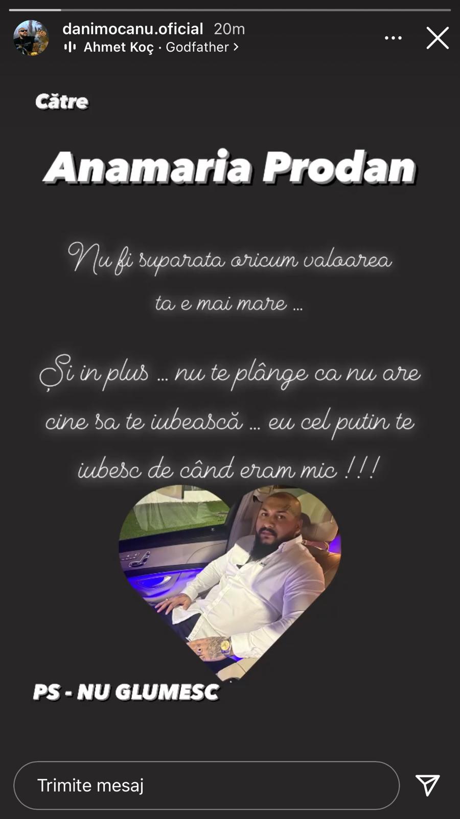 Către Anamaria Prodan. Nu fi supărată, oricum valoarea ta e mai mare…și în plus…nu te plânge că nu are cine să te iubească, eu cel puțin, te iubesc de când eram mic. PS: Nu glumesc”, a scris manelistul, pe contul lui de Instagram. Mai mult, Dani Mocanu îi transmite public vedetei că următoarea piesă pe care o s-o lanseze este pentru ea.