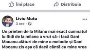Liviu a aflat și a scris o postare dură pe contul lui de socializare pe care ulterior a șters-o: ”Un prieten de la Milano, mai exact cumnatul lui Bidi de la Milano a vrut să-i facă Dani Mocanu alături de mine o melodie și Dani Mocanu a zis că dacă cântă cu mine vrea 5.000 euro, iar dacă cântă singur vrea 3.000 euro. (Adică mă ajută să mă lansez)… Dani Mocanu, noi ăștia mai vechi am inventat genul ăsta nenicule. Tu ai auzit de Dan Armeanca, Adrian Minune, de Vijelir, de Florin Salam, de Liviu Puștiu ai auzit și tu de ăștia?”, i-a scris Liviu lui Mocanu.