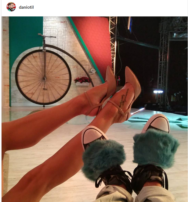 Mai exact, vrând să facă haz de papuceii cu blană care au cucerit străzile de pretutindeni în acest sezon, prezentatorul TV şi-a aplicat blaniţă verde pe tenişi şi şi-a fotografiat picioarele alături de ale Flaviei, care poartă pantofi stiletto.