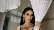 În cea de-a doua imagine postată, Daniela Crudu a purtat o lenjerie intimă neagră transparentă, pe care a asortat-o cu un colier din perle și cu o pereche de cercei supradimensionați.