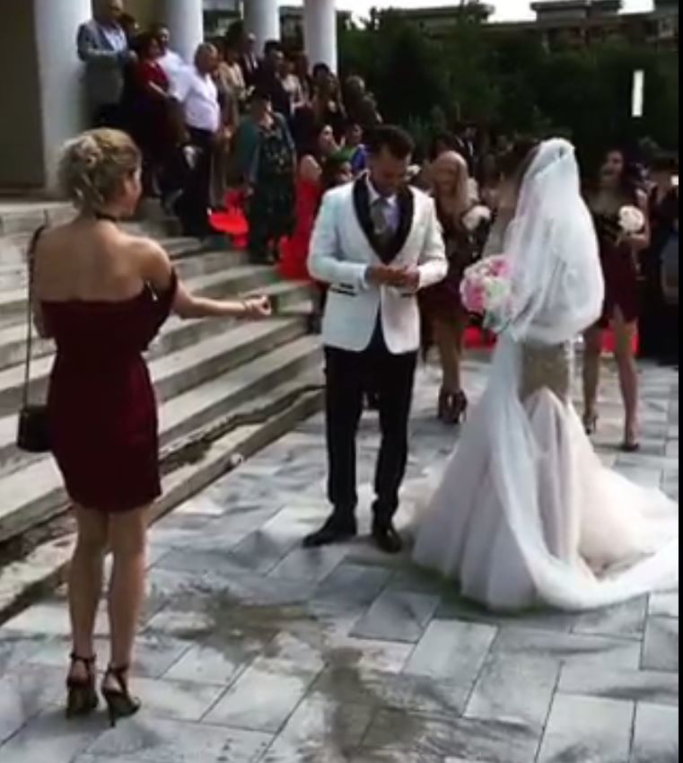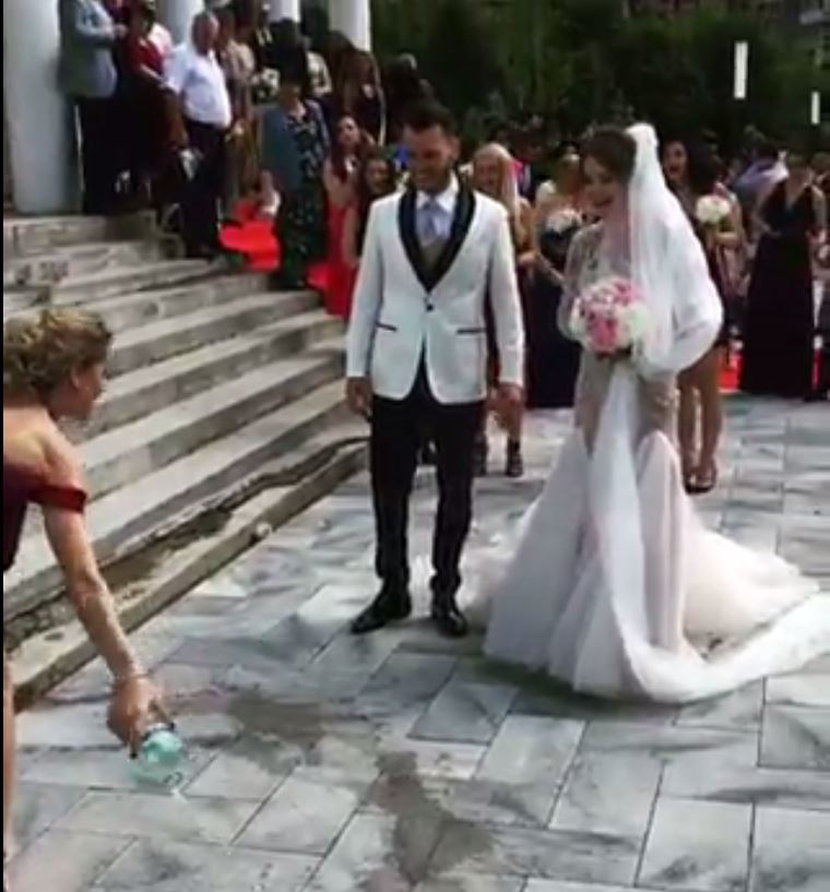 Asa ca, inainte ca mirii sa intre in local, a tinut ca acestia sa pastreze traditiile stiute de ea. Spre surprinderea tuturor, Danuta a turnat apa in fata celor doi si apoi i-a cerut mirelui sa-i dea bani. “C-asa e traditia!”, a explicat Danuta, spre amuzamentul tuturor.