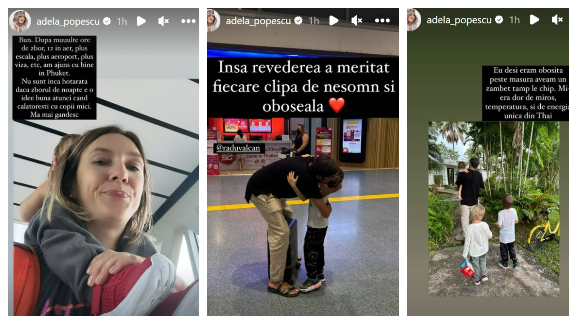Chiar dacă schimbarea de fus orar le-a dat câteva bătăi de cap, Adela Popescu susține că fiecare clipă de oboseală a meritat efortul, pentru a se reîntâlni cu soțul ei: „După multe ore de zbor, 12 în aer, plus escală, plus aeroport, plus viză etc., am ajuns cu bine în Phuket. Nu sunt încă hotărâtă dacă zborul de noapte e o idee bună atunci când călătorești cu copii mici.