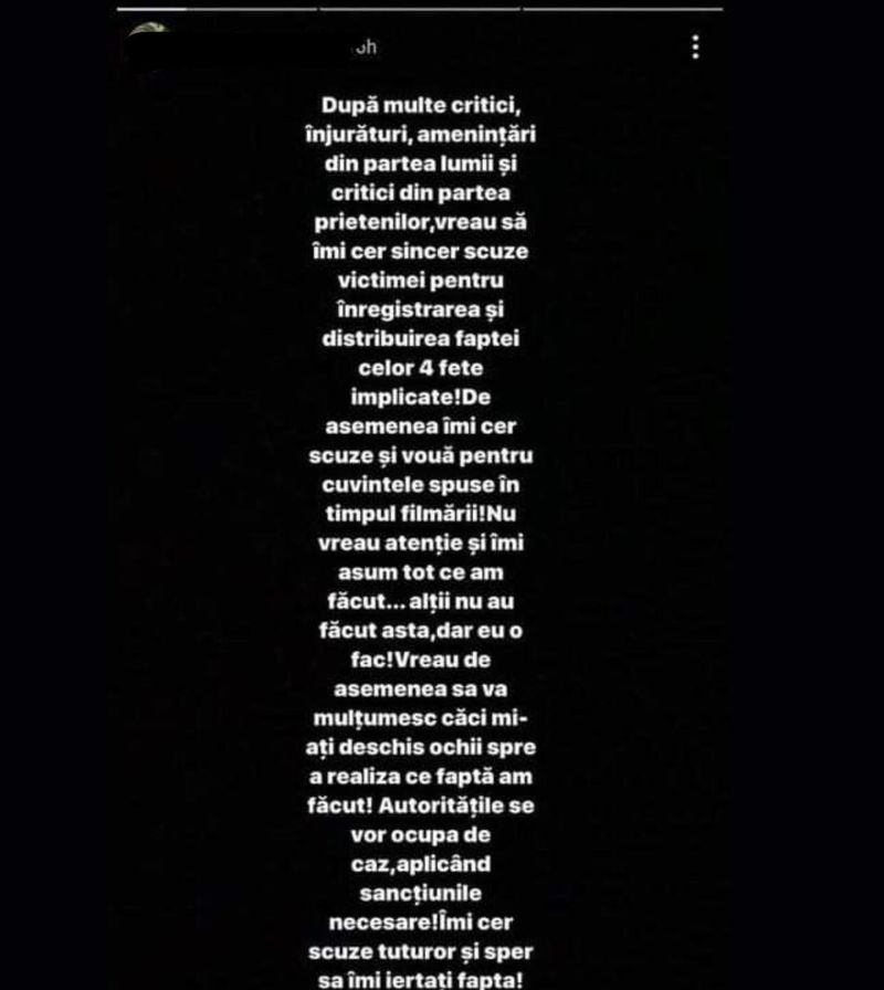 Băiatul care a filmat întreaga scenă a postat un mesaj pe o rețea de socializare, referitor la incidentul nefericit, petrecut în Târgu Jiu, când o fată de 13 ani a fost snopită în bătaie de alte minore.