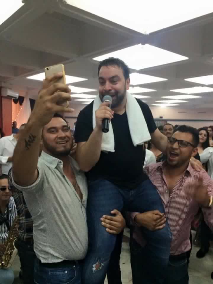 Artistul s-a lasat luat in brate de doi barbati pentru a face un selfie de senzatie. Nici macar in acele momente, Salam nu s-a oprit din cantat. Cu microfonul la gura si nelipsitul prosop atarnand in jurul gatului, a zambit pentru ca poza sa iasa perfect.