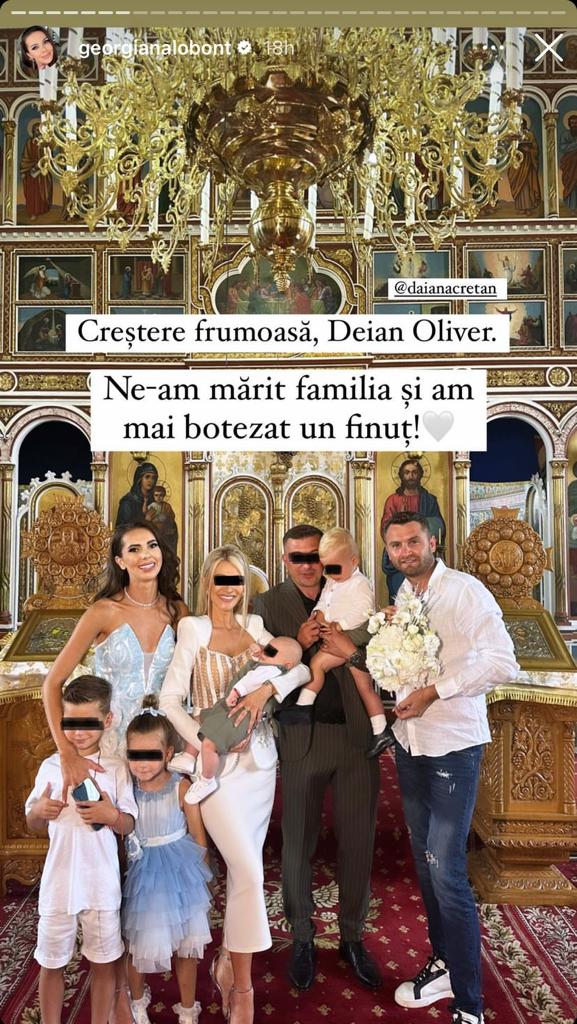 „Mergem să-l botezăm, de astăzi o să devină creștin și o să aibă îngerașul lui păzitor. Creștere frumoasă, Deian Oliver. Ne-am mărit familia și am mai botezat un finuț!”, a scris Georgiana Lobonț în mediul online.