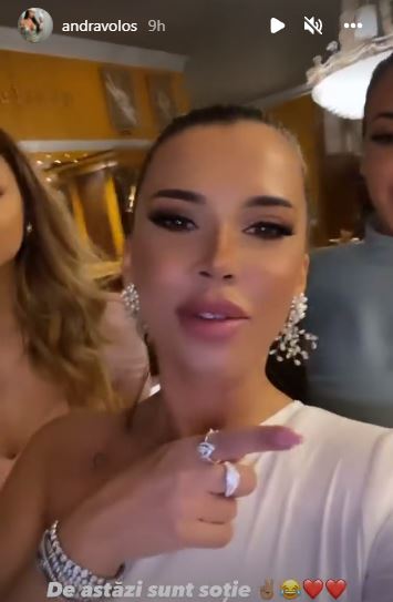 „Unde trebuie să pun inelul când sunt cerută? Pe arătător, nu? Să arăt că sunt cerută.”, a spus Andra Volos pe Instagram, alături de mesajul care era scris pe imagini, respectiv: „De astăzi sunt soție”.