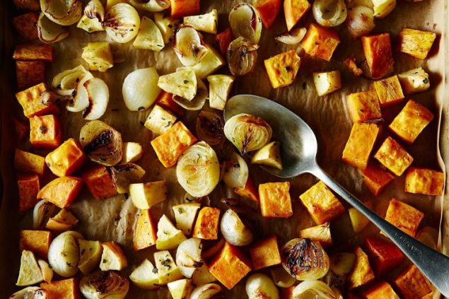 Incalzeste cuptorul la 200 grade Celsius. Amesteca uleiul de masline, condimentele si cartofii dulci, apoi pune totul la cuptor pentru 5 minute. Caleste, intr-o tigaie cu 2 linguri de ulei, ceapa si salvia. Adauga ceapa si merele in tava cu cartofi dulci si mai lasa la cuptor pentru 10-15 minute.
