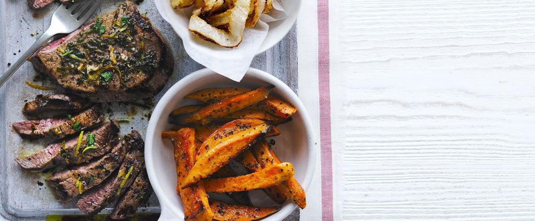Friptura chimichurri cu cartofi dulci si inele de ceapa