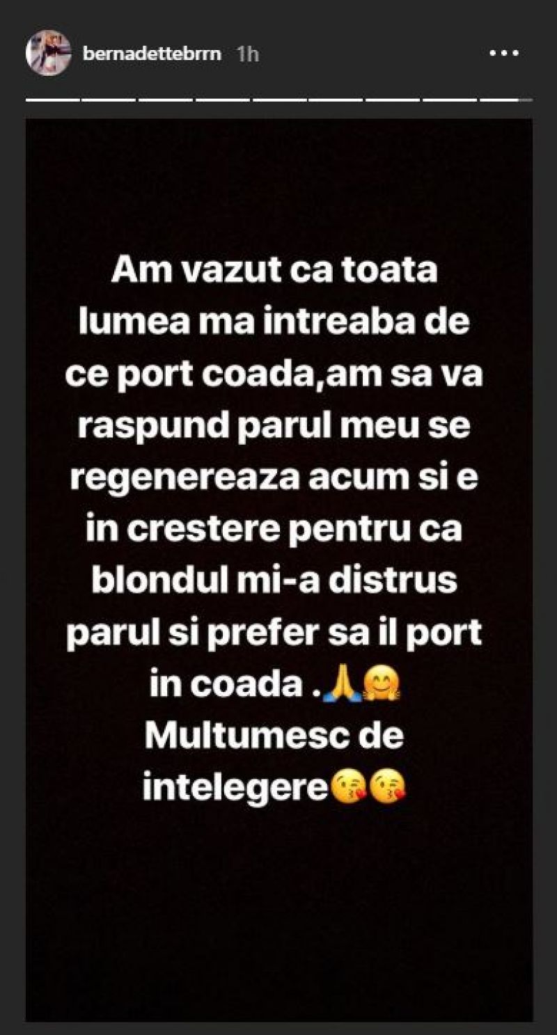 „Am văzut că toată lumea mă întreabă de ce port coadă. Am să vă răspund. Părul meu se regenerează acum și este în creștere pentru că blondul mi l-a distrus și prefer să îl port în coadă” – este explicația Bernei.