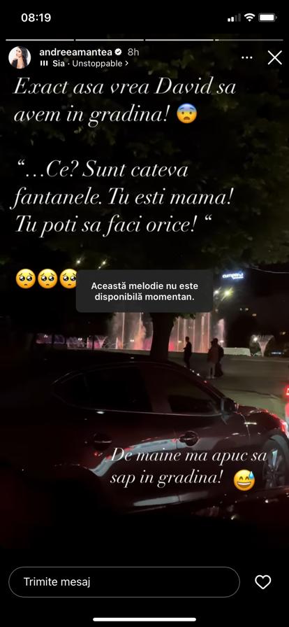 „Exact așa vrea David să avem în grădină! «Ce? Sunt câteva fântânele. Tu ești mama! Tu poți orice!» De mâine mă apuc să sap în grădină!”, a scris Andreea Mantea pe InstaStory, uimită fiind de dorința lui David.