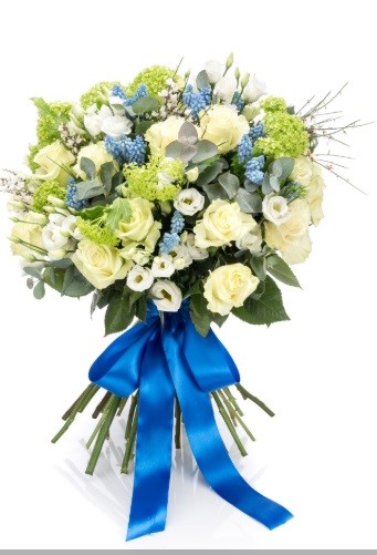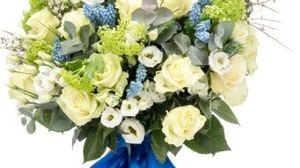 Din colectia Premium, iti recomandam un Buchet Trandafiri Albi Si Muscarii. In general, albul semnifica dragostea pura, inocenta, marcheaza un inceput in viata cuiva si respectul pentru o anumita persoana. Asa ca poti darui acest buchet unei persoane careia ii porti un imens respect, care te-a ajutat intr-un moment dificil al vietii tale. Este un buchet superb, compus din trandafiri albi delicati, muscarii, viburnum, lisianthus, genista, eucalipt si alte materiale. Pentru ca buchetul este per total deosebit, nu mai era nevoie de un ambalaj care sa ii eclipseze frumusetea, asa ca s-a optat pentru o panglica satinata, albastra, ce se potriveste perfect culorilor acestuia.