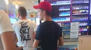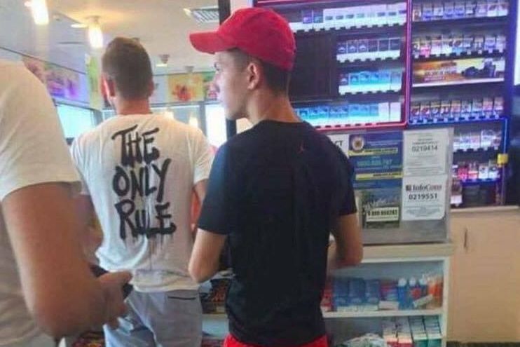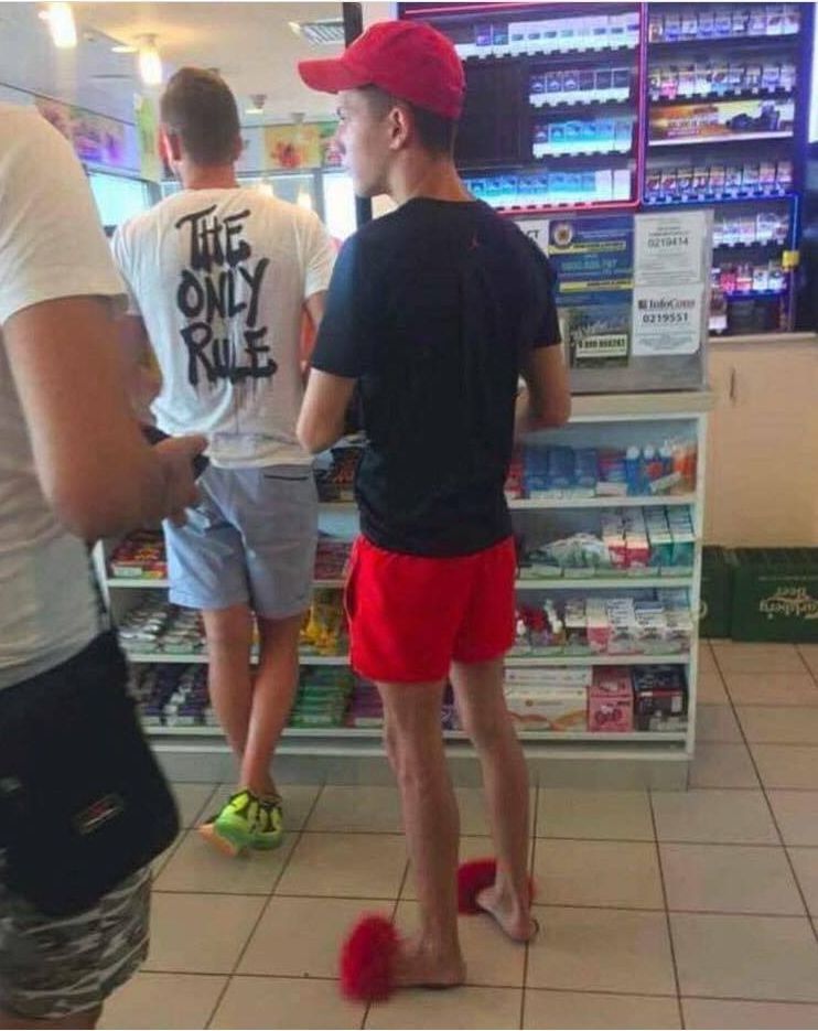 Imbracat in haine comode, de casa, baiatul s-a pus la rand la casa de marcat si nu parea sa se simta stingher din cauza faptului ca purta o pereche de papuci rosii cu puf in picioare. Ba chiar se si asortase cu sapca si pantalonii scurti!