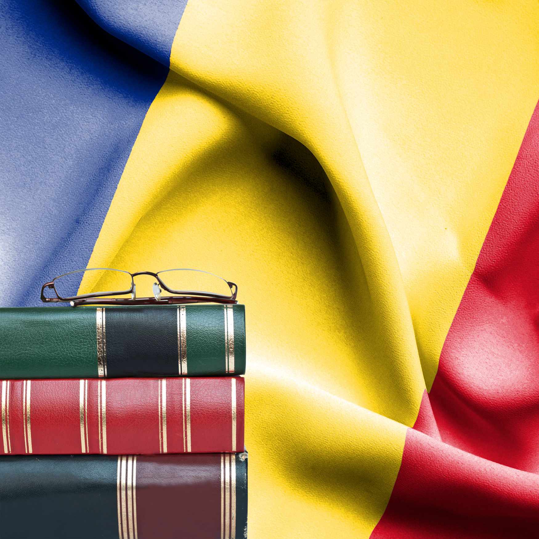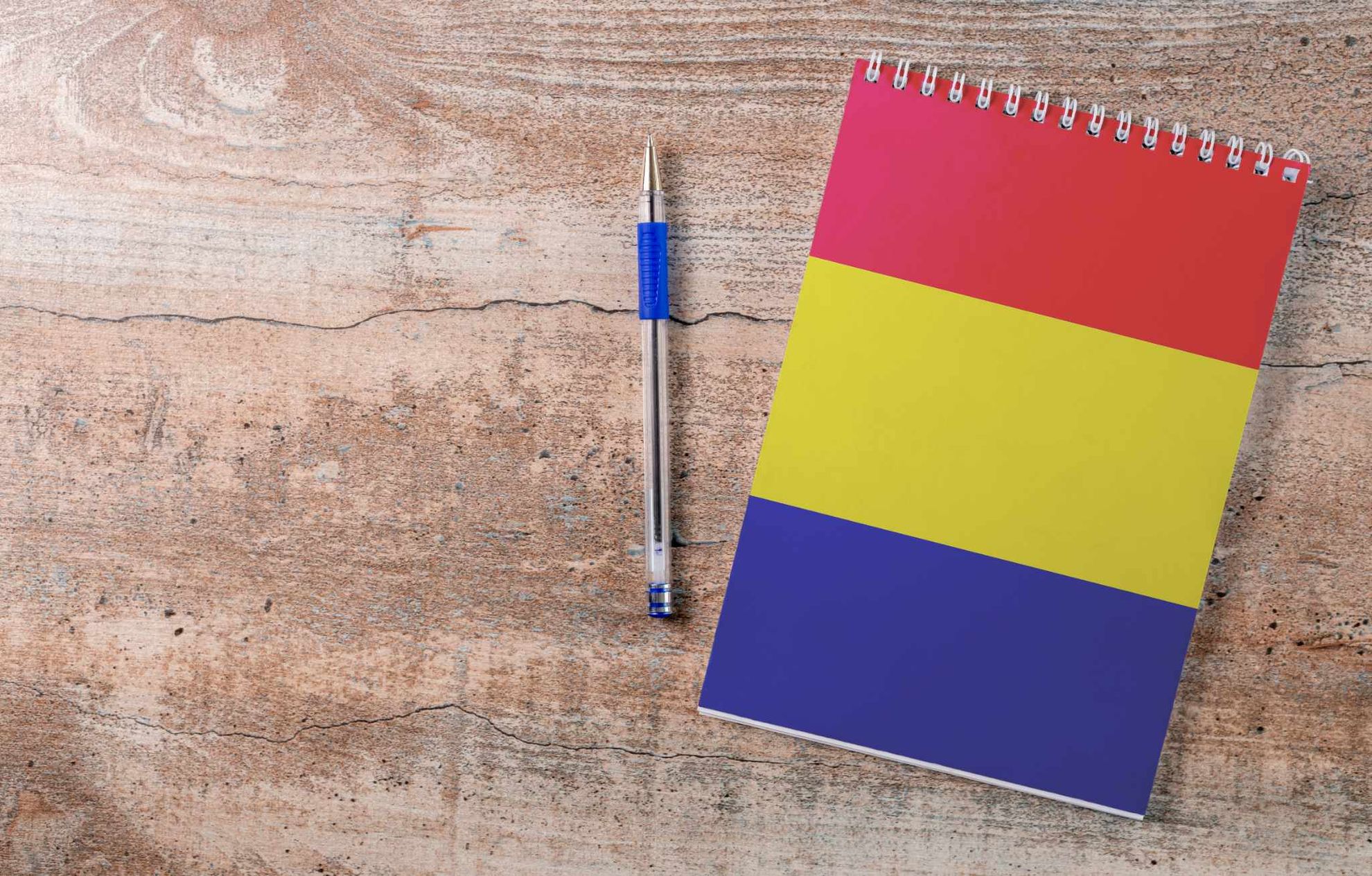 Ilustrație cu un caiet în culorile steagului României și un pix