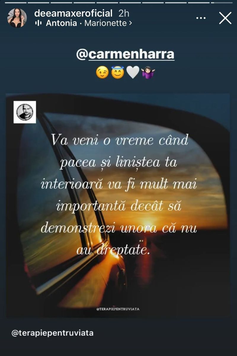 „Va veni o vreme când pacea și liniștea ta interioară va fi mult mai importantă decât să demonstrezi unora că nu au dreptate”, este mesajul distribuit de Deea Maxer, pe pagina personală de Instagram, acolo unde a etichetat-o pe Carmen Harra.