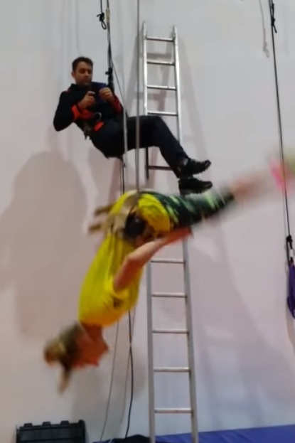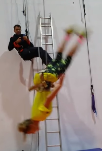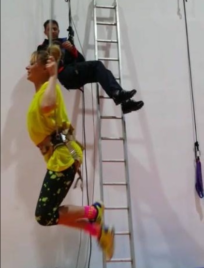 Îmbrăcată sportiv, ca şi cum ar merge la sală, Delia şi-a pus un ham şi a fost ridicată câţiva zeci de centimetri de la sol, pentru a se antrena, cel mai probabil, pentru viitorul concert pe care îl va susţine.