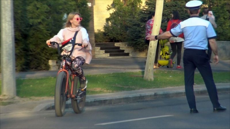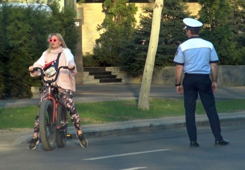 Îmbrăcată colorat şi vesel, cu ochelari de soare cu inimioare, ca o puştoaică de liceu, vedeta pedala de zor, când la un moment dat un poliţist a tras-o pe dreapta şi i-a dat nişte indicaţii.