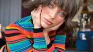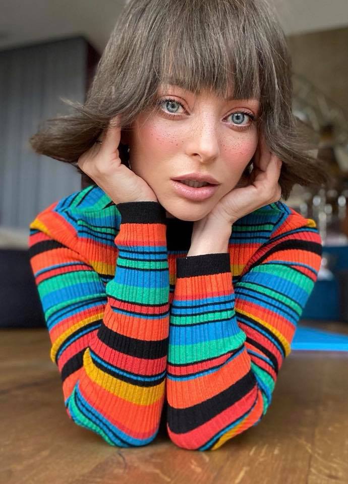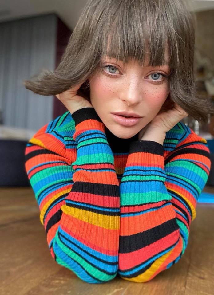 Îmbrăcată colorat, cu un machiaj absolut natural, Delia pare încântată de peruca scurtă pe care o poartă.