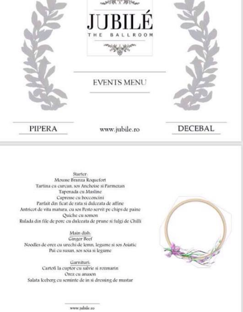 Aperitiv: mousse branza Roquefort, tartina cu curcan, sos anchoise si parmezan, tapenada cu masline, capresse cu bocconcini, parfait din ficat de rata si dulceata de afine, antricot de vita matura, cu sos pesto servit pe chips de paine, quiche cu somon, rulada din file de porc cu dulceata de prune si fulgi de chilli.