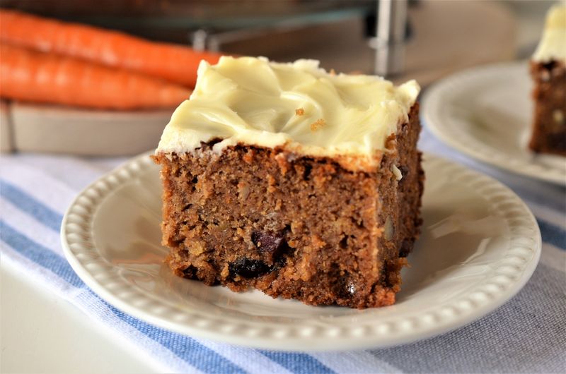 Puneți apă caldă într-un bol și presărați semințele de in. Amestecați un minut până ce semințele de in încep să absoarbă apă și amestecul se îngroașă ușor. Adăugați zahărul și vanilia până ce se dizolvă, apoi puneți coacazele uscate, morcovii și migdalele. Adăugați amestecul cu făină preparat mai devreme, după aceea puneți în tavă deja pregătită.