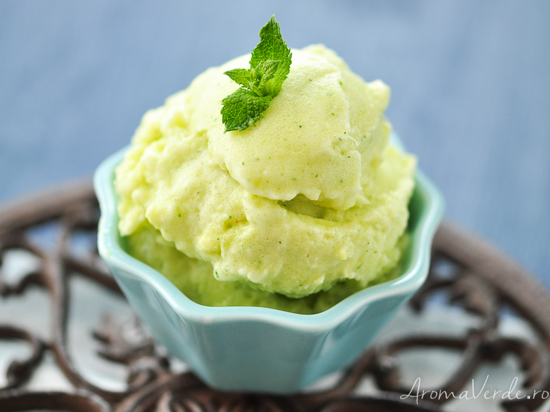Într-un blender, pasați ananasul cu tot cu siropul din conservă până ce devine o crema fină. Transferați într-un vas de metal și adăugați siropul, sucul de lămâie și sucul de portocală, plus coajă de lămâie. Puneți în congelator până se întărește puțîn, dar să nu fie înghețat total.