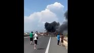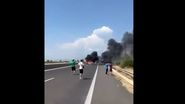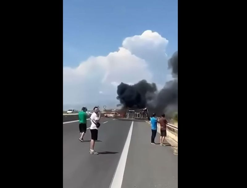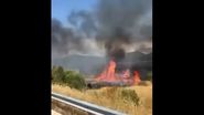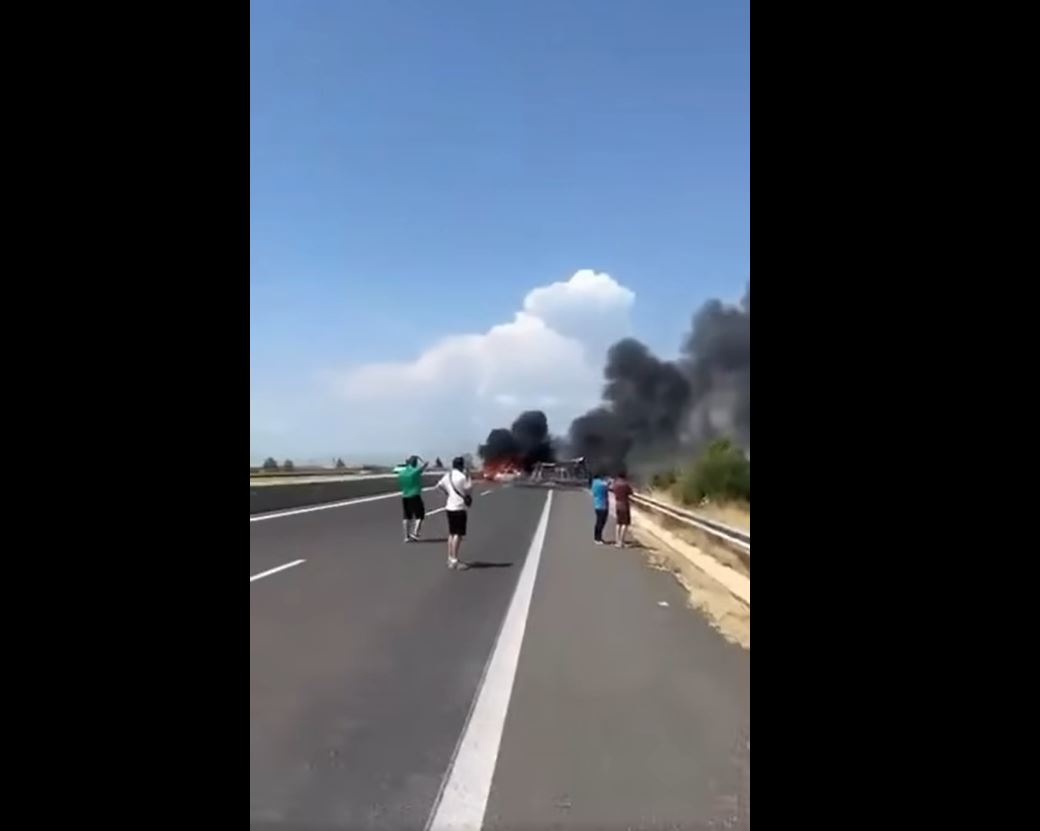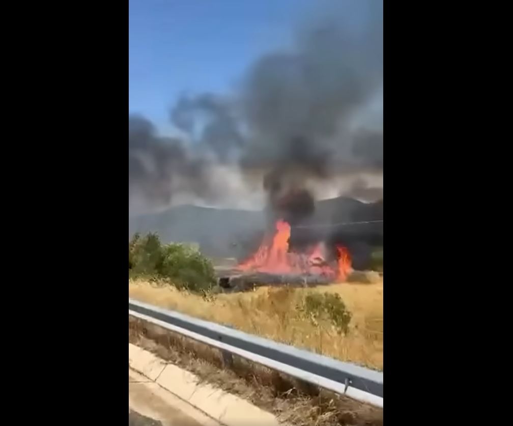În urma impactului, incendiul s-a extins rapid la vegetația uscată din jurul autostrăzii, iar pompierii au intervenit de urgență pentru a lichida flăcările.
