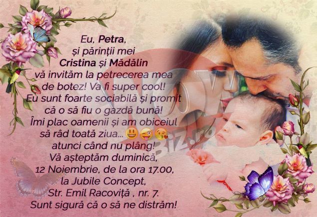 "Va fi o petrecere super cool! Sunt foarte sociabila si promit ca o sa fiu o gazda buna! Imi plac oamenii si am obiceiul sa rad toata ziua... atunci cand nu plang", este mesajul de pe invitatia bebelusei pentru participantii la botez, iar parintii Petrei vor sa puna la punct si cel mai mic detaliu. (ce a alarmat-o zilele trecute pe Cristina Siscanu! A crezut ca lesina de teama)