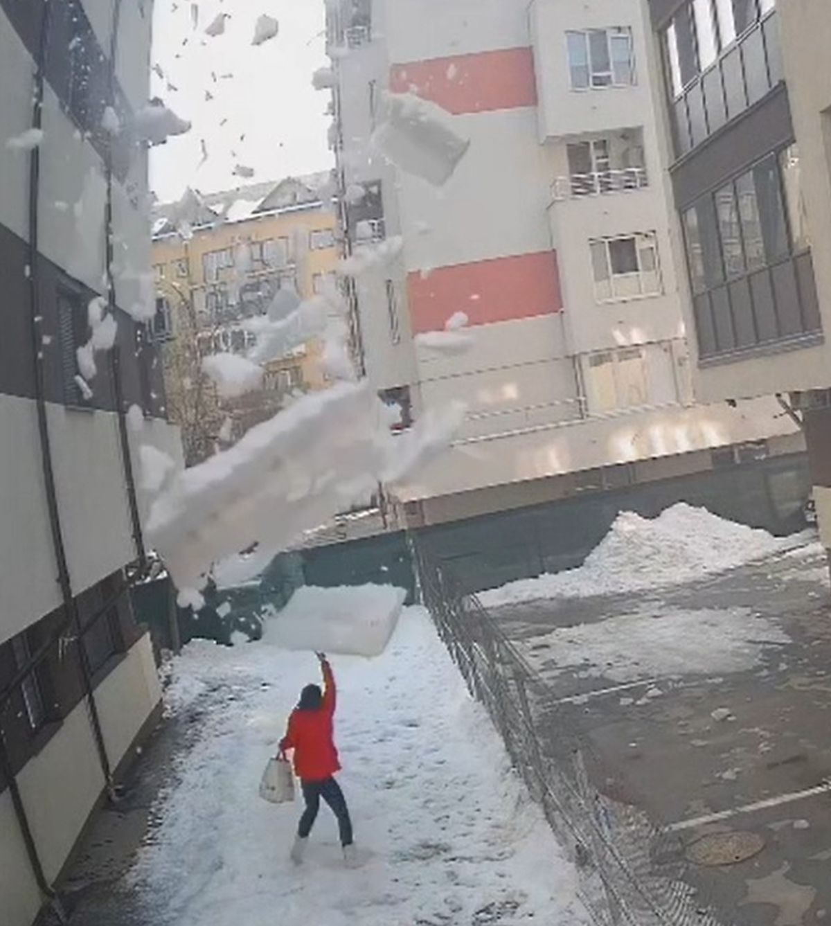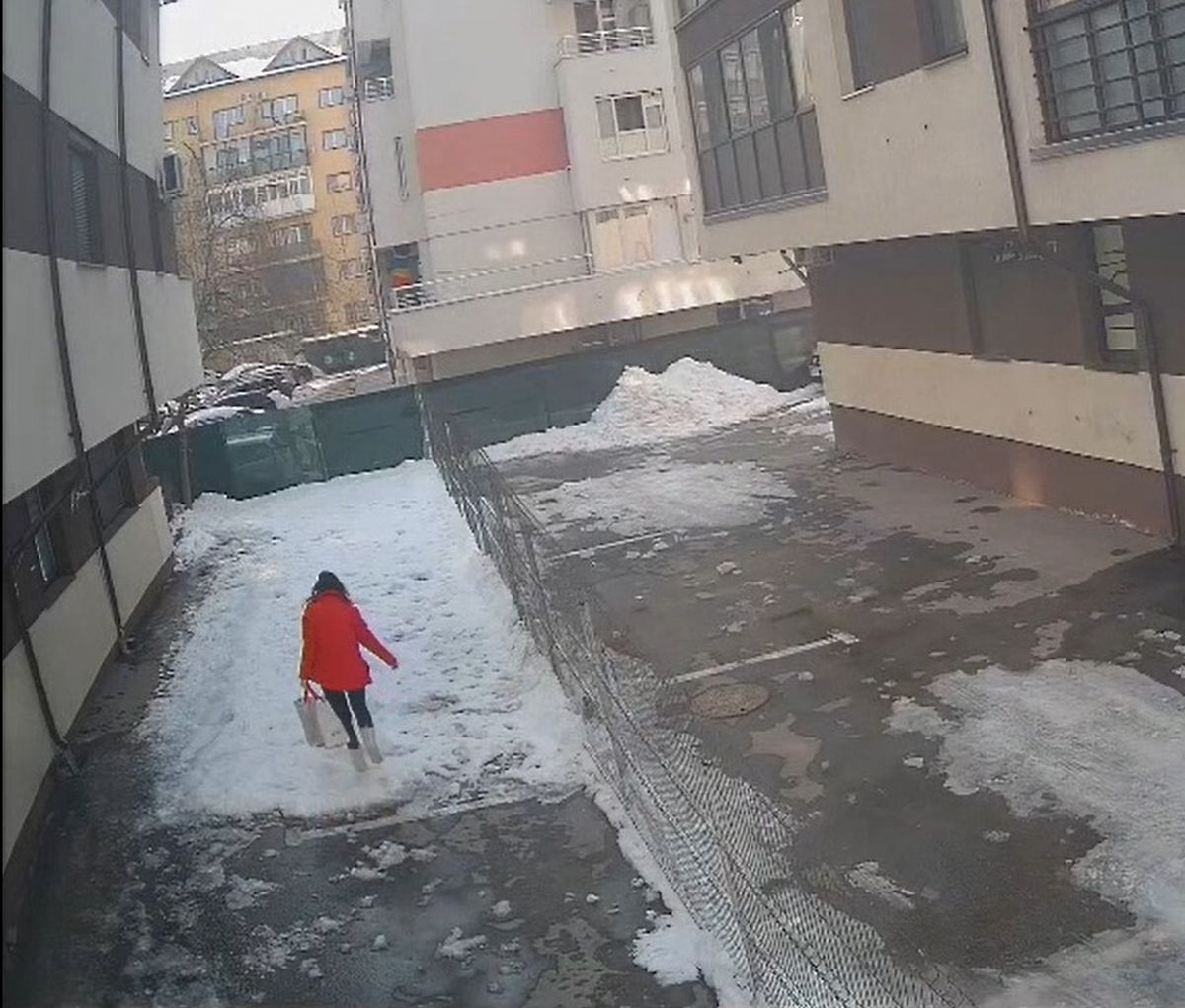 Femeia din Chiajna, mergând spre zona din spatele blocului, cu doar câteva secunde înainte să fie lovită de bucata de gheață