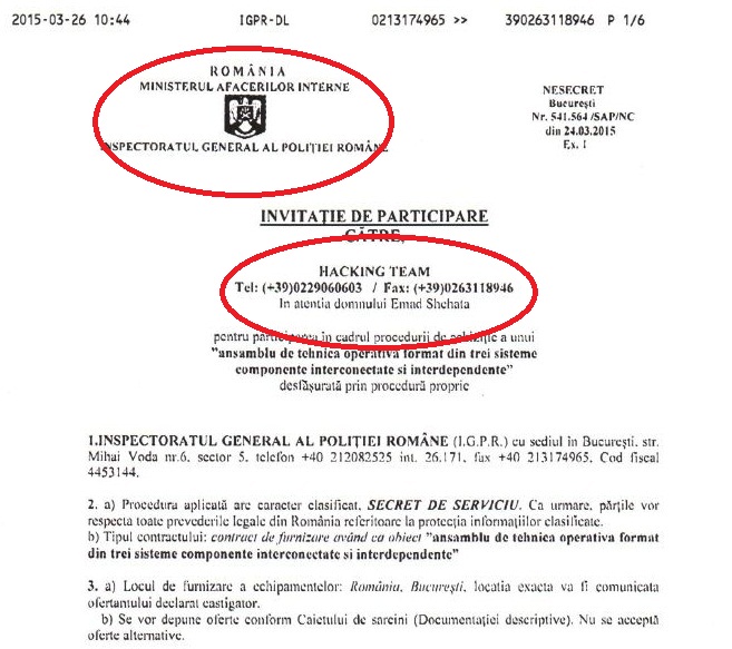 Corespondenta dintre IGPR pe de-o parte si Emad Shehata si David Vincenzetti de la Hacking Team de cealalta parte reprezinta o invitatie la o procedura de achizitie a unui „ ansamblu de tehnica operativa formata din trei