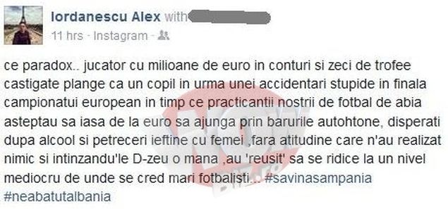 “Ce paradox.. jucător cu milioane de euro în conturi şi zeci de trofee câştigate plânge că un copil în urmă unei accidentări stupide în finală campionatului european în timp ce practicanţii noştrii de fotbal de abia aşteptau să iasă de la euro să ajungă prin barurile autohtone, disperaţi după alcool şi petreceri ieftine cu femei ,nişte frustraţi, fără caracter şi atitudine care n'au realizat nimic şi întinzându'le