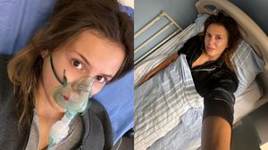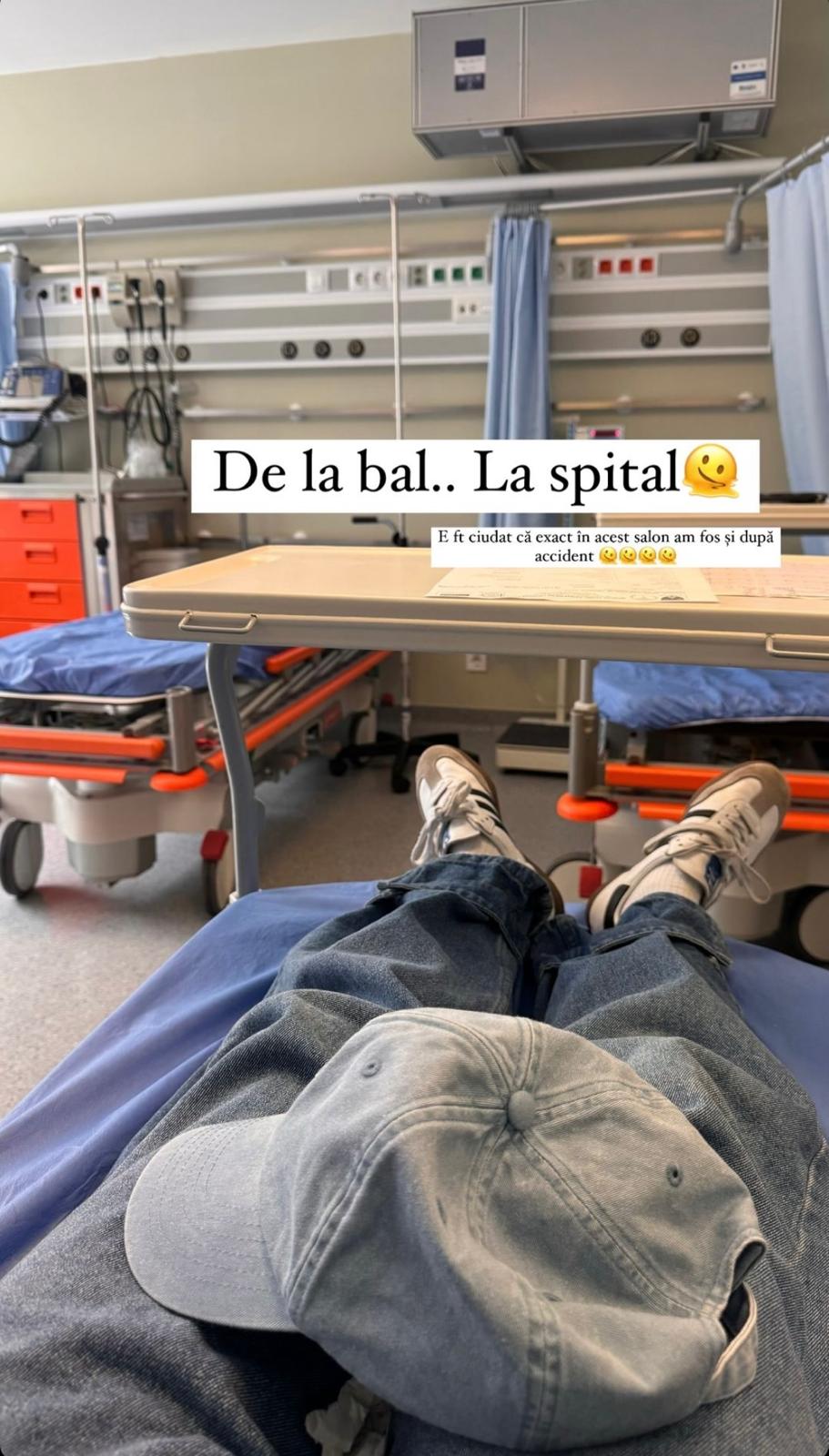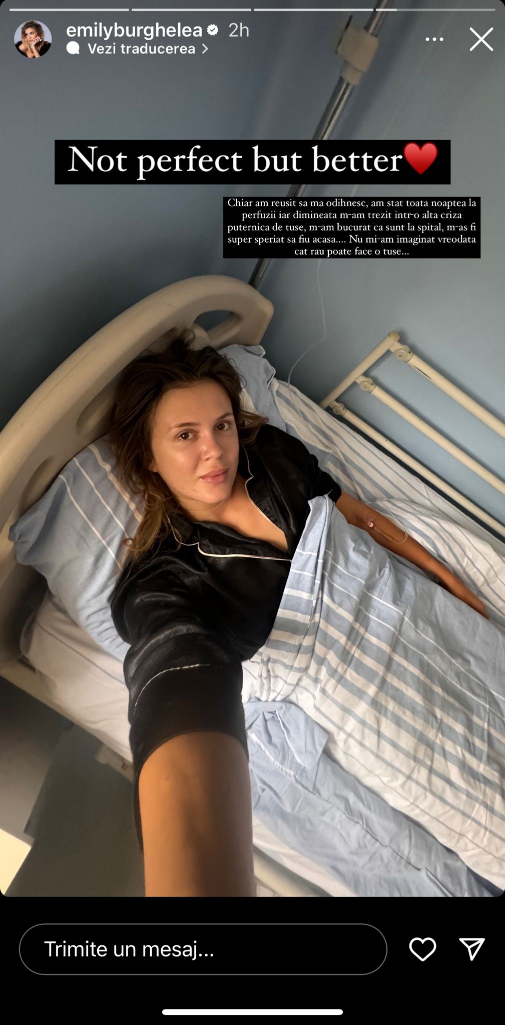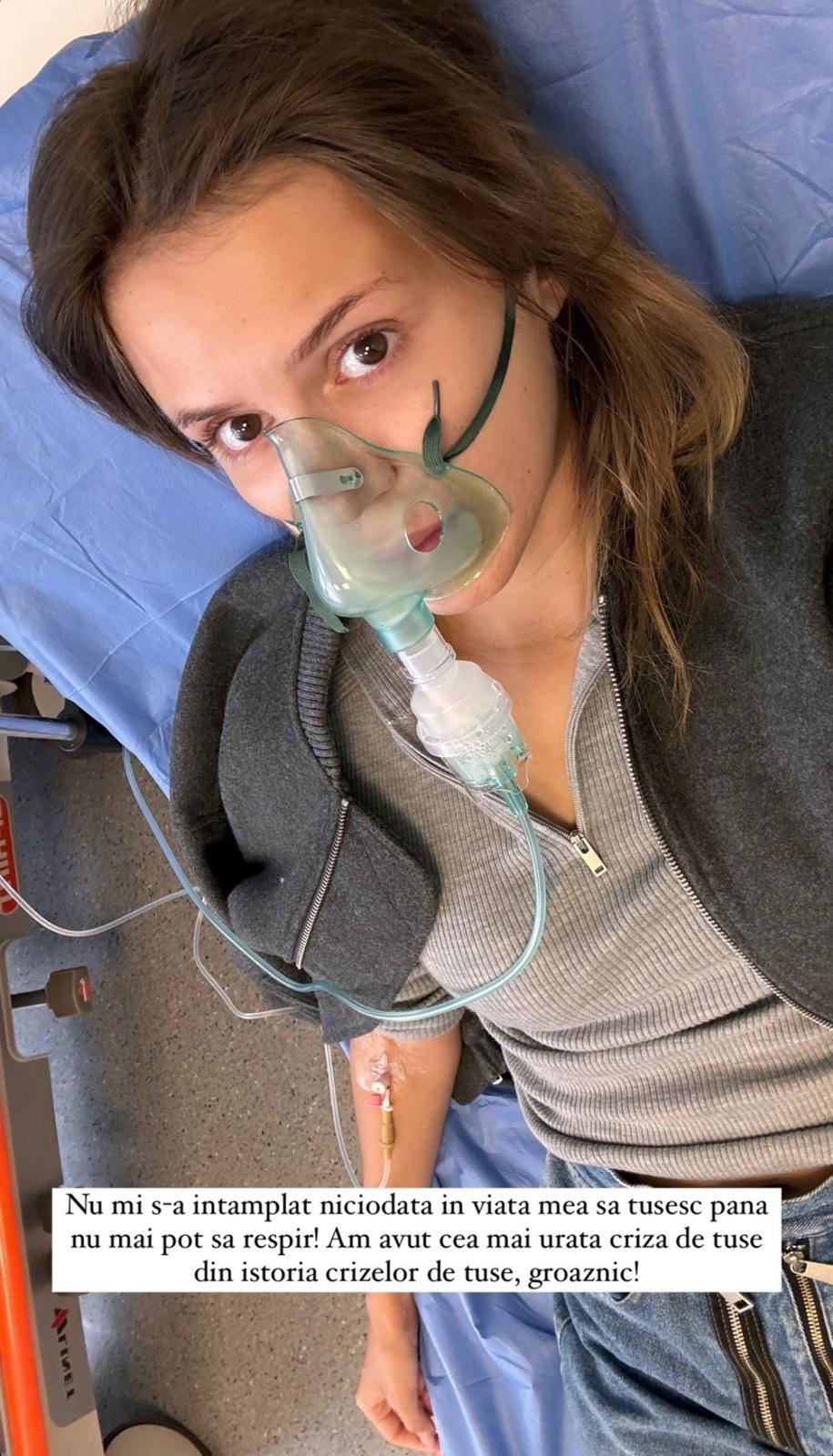 „Nu mi s-a întâmplat niciodată în viața mea să tușesc până nu mai pot să respir! Am avut cea mai urâtă criză de tuse din istoria crizelor de tuse, groaznic!”, a scris Emily Burghelea în dreptul unei fotografii de pe patul de spital.