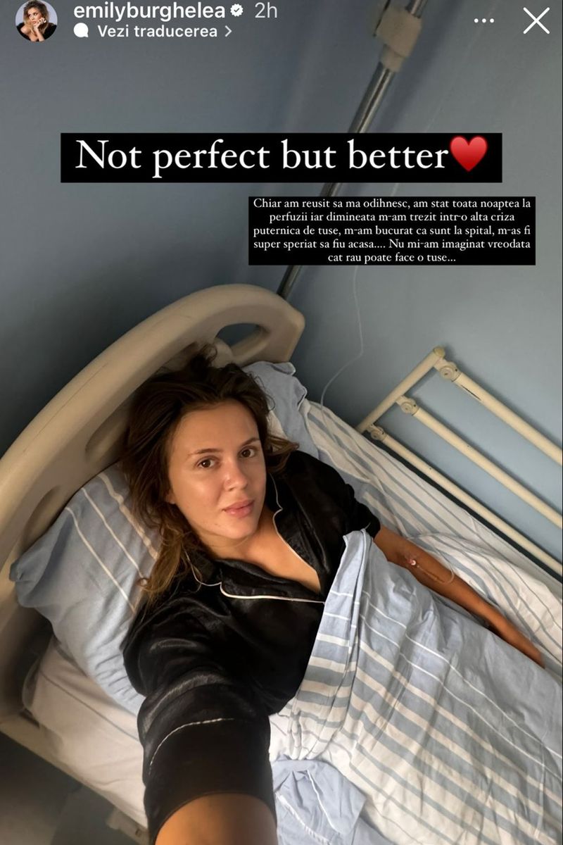 „Pneumonie… Rămân internată. (…) Chiar am reușit să mă odihnesc, am stat toată noaptea la perfuzii, iar dimineața m-am trezit într-o altă criză puternică de tuse. M-am bucurat că sunt la spital, m-aș fi super speriat să fiu acasă… Nu mi-am imaginat vreodată cât tău poate face o tuse…”, a scris Emily Burghelea, pe pagina personală de Instagram.
