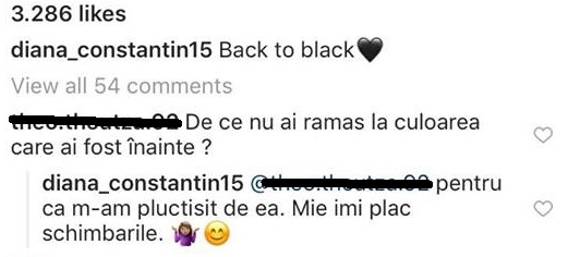Diana Constantin, fosta concurentă de la Insula Iubirii a postat pe rețelele de socializare o nouă imagine cu ea! De data aceasta, fosta iubită a lui Ben și a lui Aurel a mărturisit că i-a fost dor să fie brunetă, astfel că s-a și vopsit imediat, scriind în dreptul pozei ”back to black” (înapoi la negru).