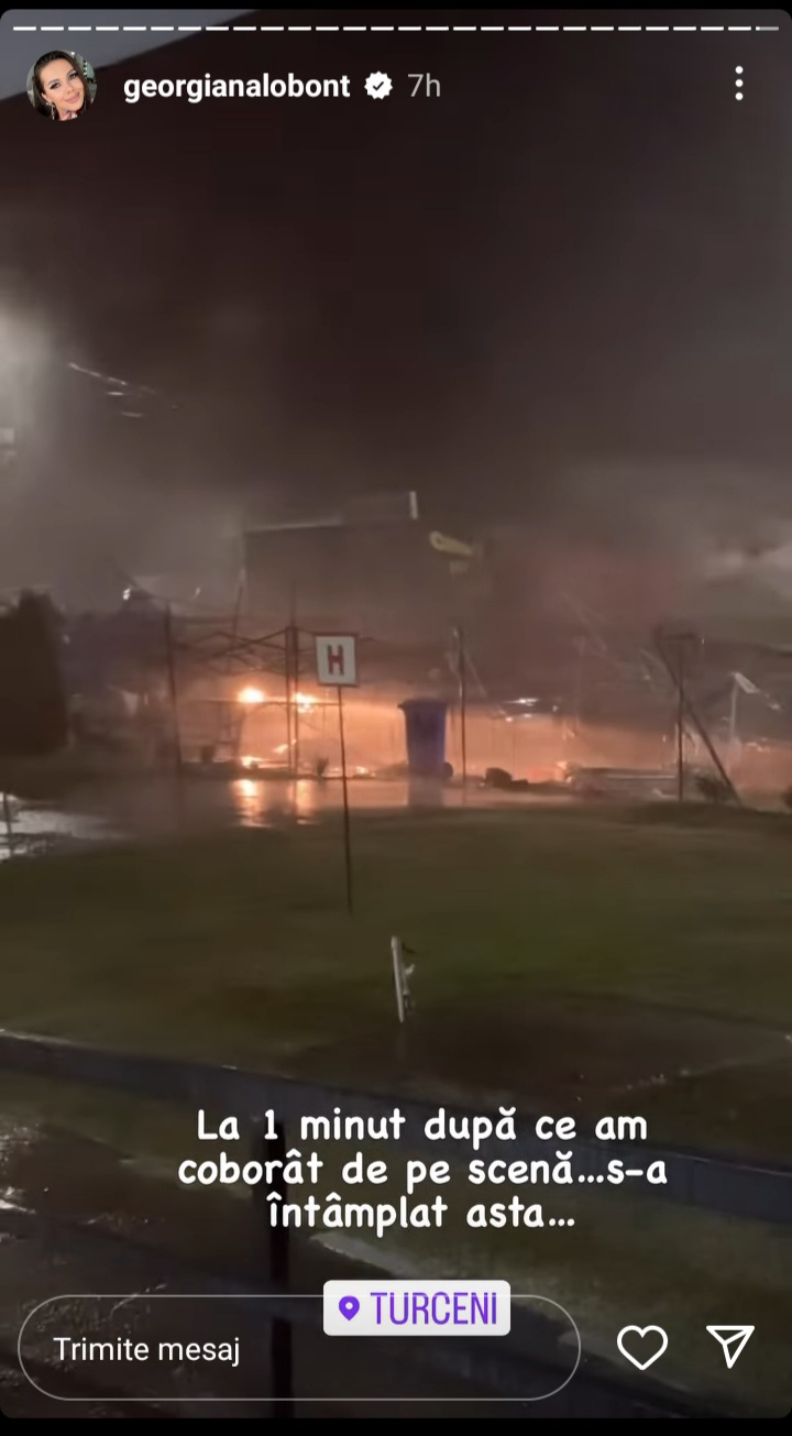 O să vă pun să vedeți cât de fain a fost la spectacol și ce s-a întâmplat după. Fac story-urile acestea pentru că au fost foarte mulți oameni în fața scenei și, din păcate, au venit vijelia și ploaia. A devastat pe aici totul. Săracii oameni, nu știu cum au ajuns acasă(…)Doamne ferește, sper că sunteți bine!”, a povestit Georgiana Lobonț pe contul său de Instagram, fiind vizibil îngrijorată pentru fanii săi.