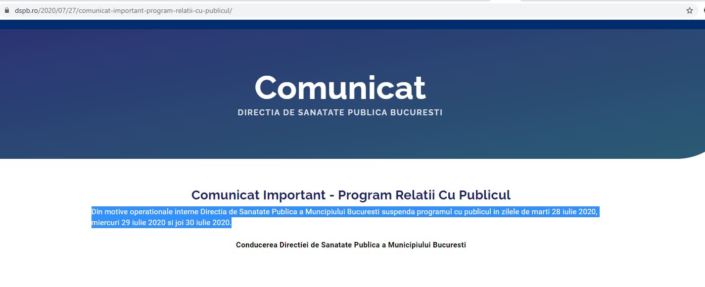 Direcția Publică pentru Sănătate, instituția abilitată prin care oamenii ar trebui să primească ajutor în cazul infectării cu COVID-19, nu este de găsit la niciun număr de telefon afișat pe site-ul oficial. Mai mult decât atât, DSP a anunțat prin intermediul unui comunicat pe site-ul lor că „din motive operationale interne Directia de Sanatate Publica a Muncipiului Bucuresti suspenda programul cu publicul in zilele de marti 28 iulie 2020, miercuri 29 iulie 2020 si joi 30 iulie 2020”.