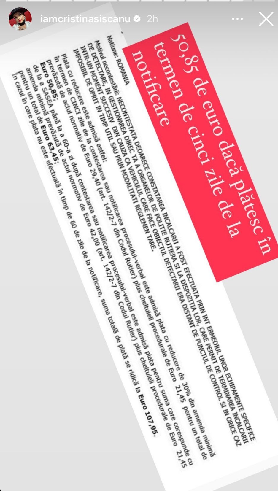 Soția lui Mădălin Ionescu nu s-a ferit să le arate celor care o urmăresc în mediul online nici ce valoare are amenda pe care va trebui să o plătească, după contravenția comisă: "Ați văzut, dat? Limita de viteză era de 70 km/h și noi am condus cu 71,05 km/h. Stați să vedem cât avem de plătit: 50, 85 de euro dacă plătesc în termen de cinci zile de la notificare. Doamne, ce lege absurdă! Mă rog, vă dați seama că voi plăti."