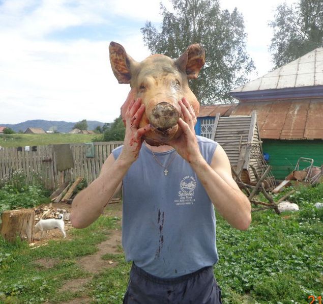 Un locuitor din judetul Braila si-a facut o poza pe care a postat-o ulterior pe o retea de socializare. Probabil ca el a crezut ca este foarte amuzant, dar nu intelegem ce poate fi funny la o imagine in care in loc de capul lui si-a pus in cap de porc. Oare asa se simte el? Sau doar a vrut sa socheze intr-un mod grotesc si lipsit de umor. Va lasam pe voi sa judecati!