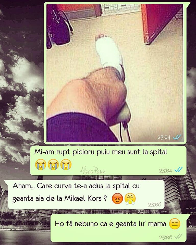 Un tip a ajuns la spital in stare grava dupa ce si-a rupt piciorul. Prima lui reactie a fost sa-i scrie iubitei pe whats app sa o anunte de nenorocirea care s-a abatut asupra lui. Fata a avut un raspuns neasteptat. In loc sa-l compatimeasca si sa-i spuna ca vine intr-un suflet la spital, a apucat-o crizele de gelozie.