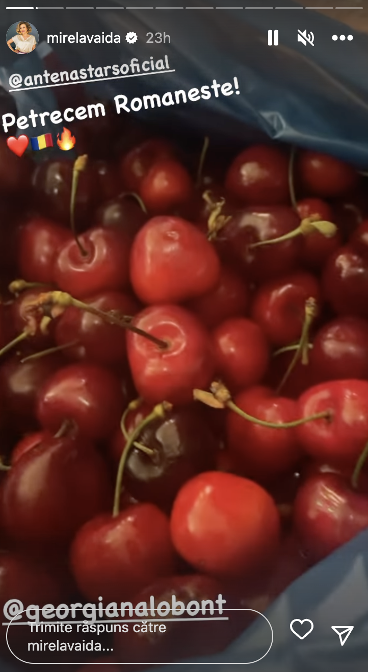 Mirela Vadia: „Vali Vijelie a dat comandă, el a plătit și noi mâncăm. Georgiano, lasă că mâncăm și noi, fată, că abia ne ținem. Uită-te la tine ce frumoasă și ce slabă ești și ce bine îți stă cu cireșele astea în poală. Petrecerea să meargă, noi mâncăm câteva cireșe și venim.”