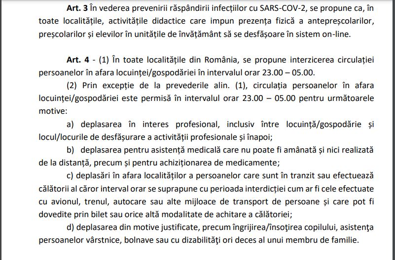 Art. 4 – (1) În toate localitățile din România, se propune interzicerea circulației persoanelor în afara locuinței/gospodăriei în intervalul orar 23.00 – 05.00.