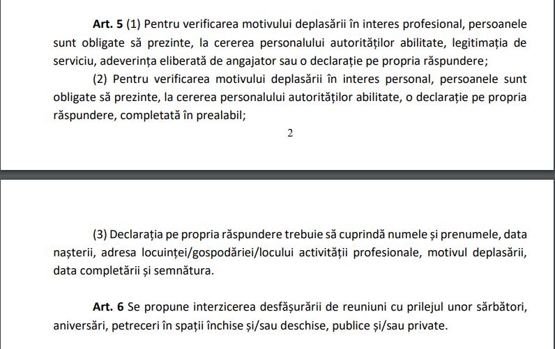 Art. 5 (1) Pentru verificarea motivului deplasării în interes profesional, persoanele sunt obligate să prezinte, la cererea personalului autorităților abilitate, legitimația de serviciu, adeverința eliberată de angajator sau o declarație pe propria răspundere;