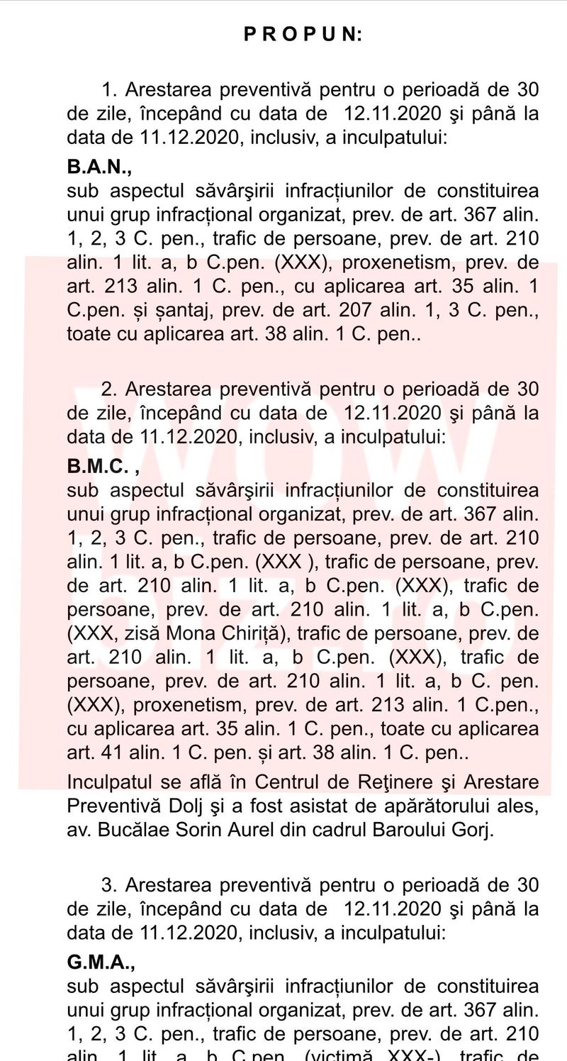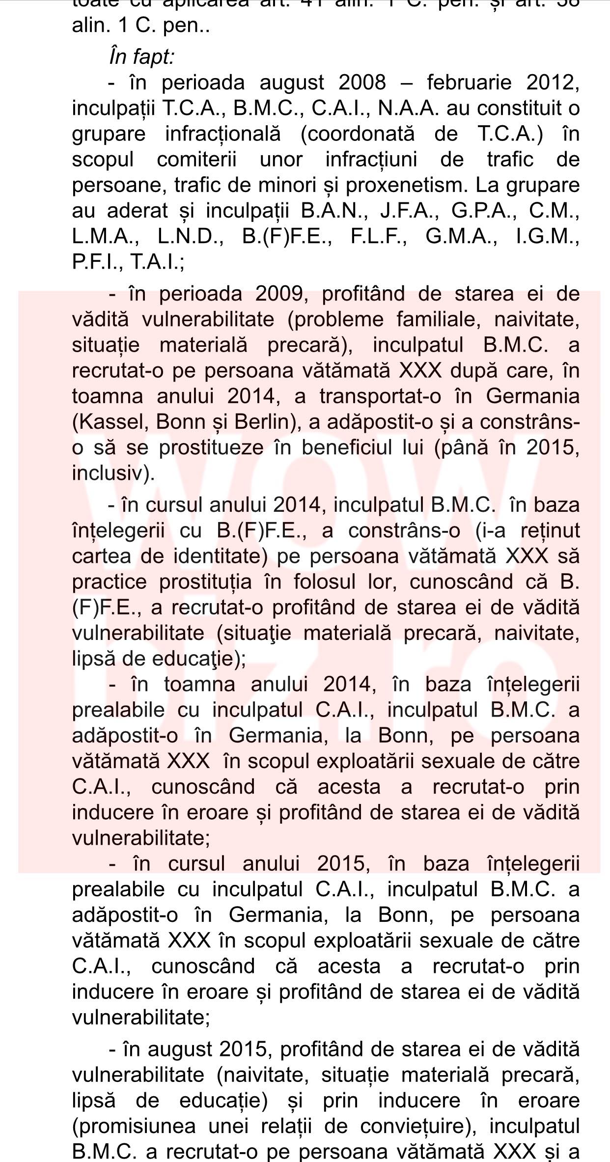 În unele situații, după identificarea victimelor, folosind metoda „loverboy”, membrii grupării le câștigau încrederea, și sub pretextul unui viitor comun și oferirii unui mod de viață lipsit de griji, le convingeau să se deplaseze cu ei în diferite țări, unde, prin acte de violență și amenințări, le determinau să practice prostituția în folosul lor”, sunt doar câteva fragmente din document.