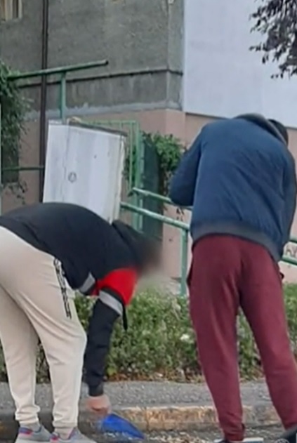 Oamenii legii i-au pus să strângă toate cojile de pe trotuar. Astfel, cei doi au fost pozați în timp ce au lăsat toată aroganța și au pus mâna pe măturică. În timp ce unul mătura, celălalt ținea fărașul.