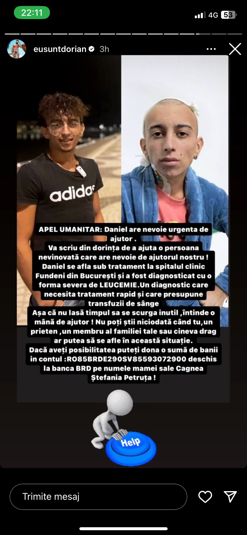 „Apel umanitar: Daniel are nevoie urgentă de ajutor. Vă scriu din dorința de a ajuta o persoană nevinovată, care are nevoie de ajutorul nostru! Daniel se află sub tratament la spitalul clinic Fundeni din București și a fost diagnosticat cu o formă severă de leucemie. Un diagnostic care necesită tratament rapid și care presupune transfuzii de sânge, așa că nu lăsa timpul să treacă inutil, întinde o mână de ajutor!