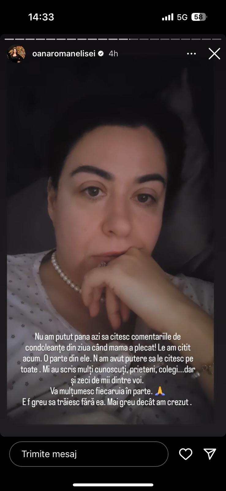 „Nu am până azi să citesc comentariile de condoleanțe din ziua când mama a plecat! Le-am citit acum. O parte din ele. N-am avut putere să le citesc pe toate. Mi-au scris mulți cunoscuți, prieteni, colegi…dar și zeci de mii dintre voi. Vă mulțumesc fiecăruia în parte. E foarte greu să trăiesc fără ea. Mai greu decât am crezut.”, a fost mesajul transmis de Oana Roman pe Instagram.