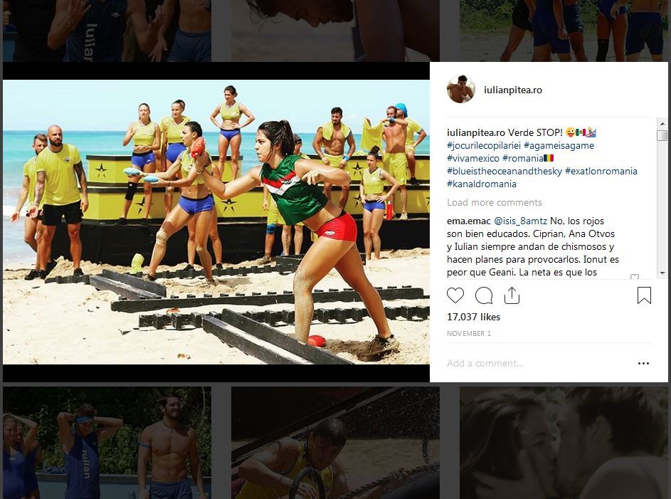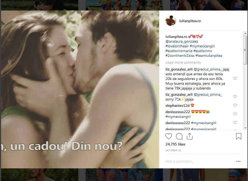 Din acest punct de vedere este extrem de interesant ce se întâmplă şi pe conturile oficiale de socializare, administrate de apropiaţii celor doi. În afară de faptul că povestea lor de dragoste aproape că le-au dublat numărul de fani (Ana a ajuns la 275.000 urmăritori pe Instagram în vreme ce Iulian a ajuns la 90.000), cei doi au fost mai degrabă discreţi. Iulian a postat (prin intermediari) o singură imagine în care o sărută pe Ana, iar la câteva zile distanţă o fotografie cu mexicanca în timpul unui traseu. De cealaltă parte, pe contul Anei nu apare nici o fotografie cu Iulian şi nici o referire la acesta.