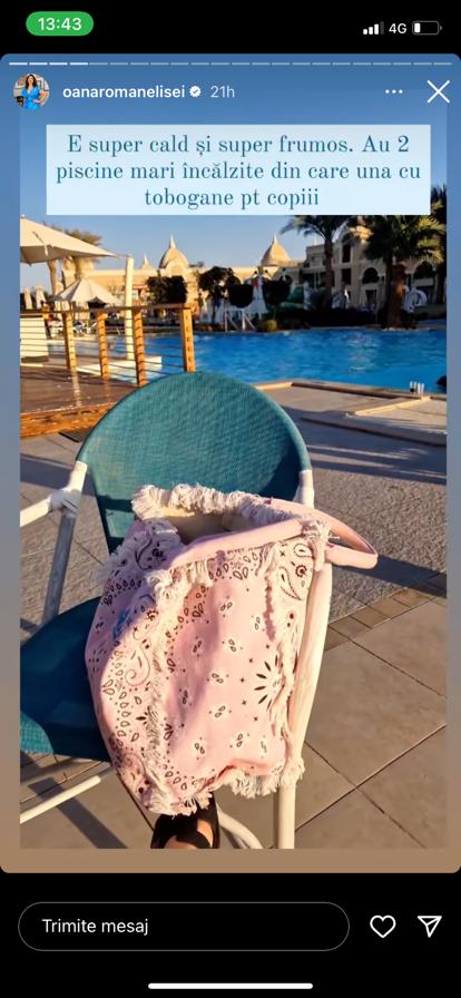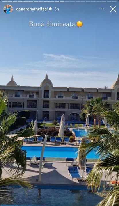 „E super cald și super frumos. Au două piscine mari încălzite, din care una cu tobogane pentru copii. Marea este foarte aproape de camere și plaja este cu nisip fin. Vă arăt când ajung din nou azi la plajă.”, a scris Oana Roman în mediul online, vizibil entuziasmată de locul în care a ajuns alături de fiica sa.